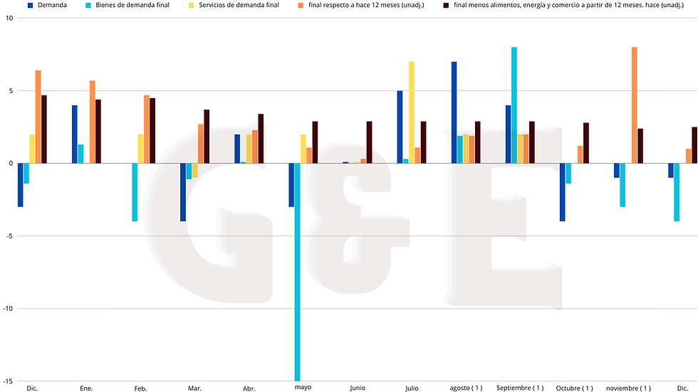 El índice de Bienes disminuyó un 0.4% en diciembre, siendo el tercer descenso consecutivo. La caída se atribuyó en un 60% a la disminución de los precios de la energía de demanda final. Los precios de los bienes, excluyendo alimentos y energía, se mantuvieron sin cambios. La disminución se debió en un 50% a la caída de los precios del combustible diesel y otros índices, mientras que los precios de la gasolina aumentaron.