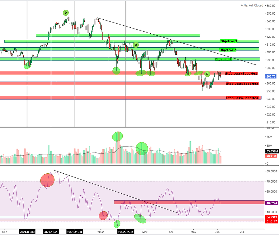 La acción de Microsoft, han perdido mas del 22% desde su máximo, entrando en una zona de sobre venta extrema de acuerdo a 8 de 10 indicadores técnicos, fundamentalmente estable y con un nivele del volatilidad medio, podríamos ver a la acción consolidar nuestros soportes 1 o 2 para después brincar de forma positiva.