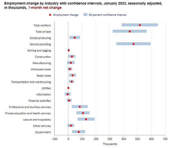 En enero se crearon 517,000 nominas no agrícolas en EE.UU durante enero, según informo la Oficina de estadísticas laborales del país, esta cifra fue mucho mayor a las previsiones que esperaban 185,000 nominas, el crecimiento fue impulsado principalmente por las nominas en ocio y hospitalidad.